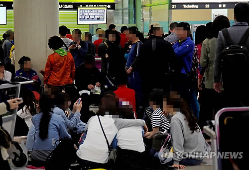 | △ (제주=연합뉴스) 고성식 기자 = 11일 오후 제주공항에 강풍과 윈드시어 특보가 내려져 항공기 결항이 속출한 가운데 몇몇 이용객들이 '전편이 결항됐다'고 안내문을 표출한 한 항공사의 발권 데스크 앞에 주저앉아 있다. 2015.05.11. koss@yna.co.kr |
