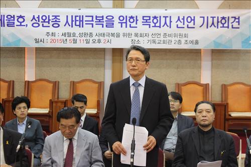 (서울=연합뉴스) 김희선 기자 = 개신교 목회자들로 구성된 '목회자선언 준비위원회'는 11일 종로구 한국기독교회관에서 기자회견을 열고 '세월호·성완종 사태 극복을 위한 목회자 선언'을 발표했다.