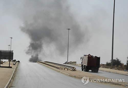 | △ 민병대 간 전투로 꼬여가는 리비아 사태 (AP=연합뉴스) 리비아 벵가지에서 15일(현지시간) 정부군 지지를 받고 있는 비이슬람계 민병대 '국민군' 주둔지가 이슬람계 민병대의 포격을 받아 검은 연기에 휩싸이자 소방차가 급히 달려가고 있다. 국민군은 리비아 퇴역장성 칼리프 하프타르가 이끌고 있다. 이날 벵가지에서 벌어진 두 민병대 간의 치열한 교전으로 최소 12명이 사망한 것으로 알려졌으며 이집트는 리비아 의회의 요청으로 벵가지에 전투기를 출격시켜 이슬람 민병대에 공습을 가했다. (AP Photo/Mohammed el-Sheikhy) |