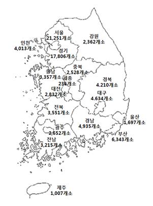 2014년 인구 1만명당 요양기관은 16.88개소로, 기초자치지역 중 가장 많은 곳은 대구 중구(66.74개소)였다. 반면 가장 적은 곳은 부산광역시 강서구(8.92개소)로 파악됐다.