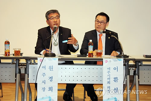 | △ 교사들과 토론하는 원경희 여주시장 (여주=연합뉴스) 강창구 기자 = 12일 오후 경기도 여주시 여주도서관에서 열린 제4차 교육발전 토론회에서 원경희 여주시장(왼쪽)이 교사들과 토론하고 있다. 2015.5.12 kcg33169@yna.co.kr |