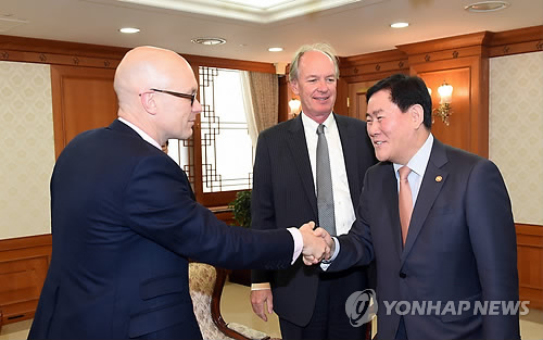 | △ 악수하는 최경환 부총리와 무디스 글로벌 국가신용등급 총괄 (서울=연합뉴스) 최경환 부총리 겸 기획재정부 장관이 12일 정부서울청사에서 알라스테어 윌슨 무디스 글로벌 국가신용등급 총괄과 면담에 앞서 악수하며 인사를 나누고 있다. (기획재정부 제공) |