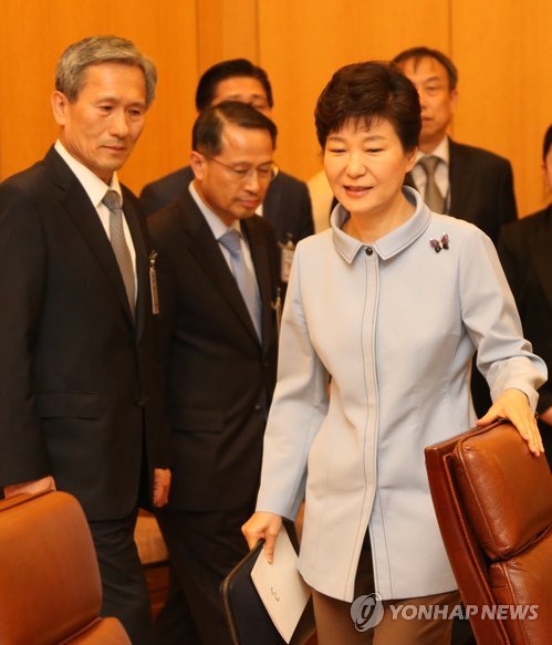 | △ 박 대통령 외교안보장관회의 참석 (서울=연합뉴스) 백승렬 기자 = 박근혜 대통령이 12일 청와대에서 열린 외교안보장관회의에 참석하고 있다. 2015.5.12 srbaek@yna.co.kr |