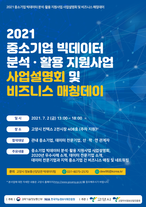 정보통신담당관 관계자는 “이번 사업은 고양시의 자생적 데이터 산업을 육성하는 계기가 될 것”이며 “특히 빅데이터 분석 여건이 부족한 중소기업들이 새로운 비즈니스 기회를 창출하고, 경쟁력을 강화할 수 있는 기회가 되길 바란다”고 말했다.