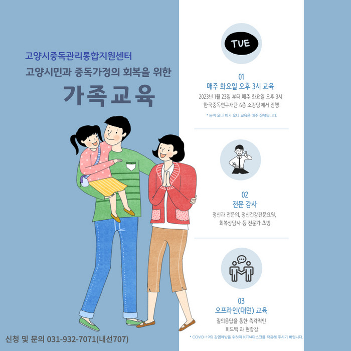 [부자동네타임즈 김인수기자] 고양특례시(시장 이동환) 중독관리통합지원센터가 알코올 중독 가족 교육 프로그램을 운영한다. 센터는 올해 1월부터 매주 화요일 대면 방식으로 교육을 진행한다고 밝혔다.