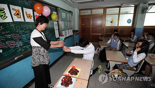 | △ 스승의 날을 맞아 학생이 선생님께 카네이션을 선물하고 있다.(연합뉴스 자료사진) |