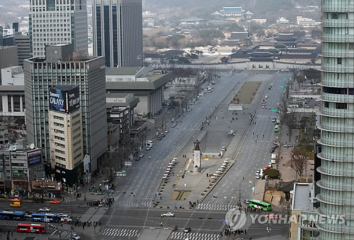 | △ 서울시는 16일 오전 7시부터 자정까지 광화문 교차로에서 세종대로 교차로 도로 전체를 통제한다고 13일 밝혔다. 차량이 통제되고 있는 광화문 일대 (연합뉴스 자료사진) |