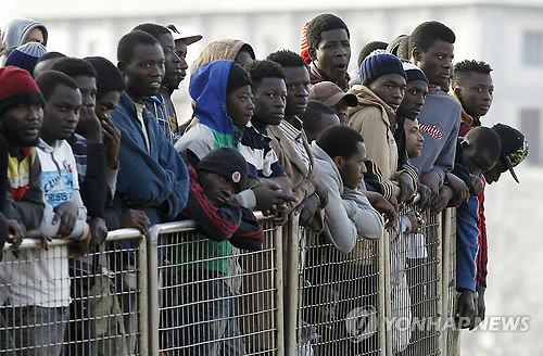 | △ (시칠리아 AP=연합뉴스) 아이슬랜드 해안경비정에 구조돼 이탈리아 시칠리아 메시나 항에 도착한 지중해 난민들이 지난 6일(현지시간) 배 앞쪽에 모여 육지에 내리기만 손꼽아 기다리고 있다. |