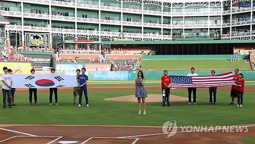 (댈러스=연합뉴스) 장현구 특파원 = MBC TV '나는 가수다'(나가수) 시즌3 가왕전의 우승자 양파가 6월 15일(현지시간) 오후 7시 5분 미국 텍사스 주 알링턴의 글로브 라이프 파크에서 열리는 미국프로야구 텍사스 레인저스-로스앤젤레스 다저스 경기에서 애국가를 열창한다.