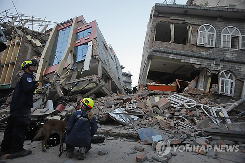 | △ 추가 강진 카트만두 피해 현장 (카트만두 AP=연합뉴스) 전날 발생한 규모 7.3의 강진으로 네팔에서 최소 65명의 사망자와 약 2천명의 부상자가 발생한 가운데, 13일(현지시간) 카트만두의 지진 피해 현장에서 미 국제개발처(USAID) 구조대원들이 무너진 건물들을 살펴보고 있다. |