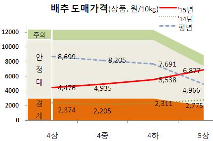 5월 상순 배추 도매가격은 10㎏당 평균 6천771원으로 지난해 같은 기간(2천775원)보다 144% 상승했으며, 평년 가격(4천966원)과 비교해도 36% 높다. 한달 전인 4월 상순(4천476원)보다는 51% 올랐다.