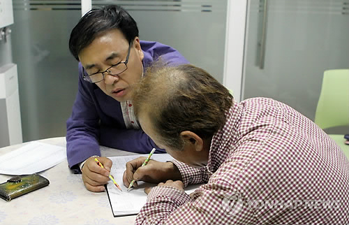 | △ 한글 가르치며 가정 행복 찾아준 '경찰관 선생님' (전주=연합뉴스) 김진방 기자 = 전북 전주덕진경찰서 여성청소년계 학교전담경찰관인 박태순 경위(왼쪽)는 담당 학교의 한 학생의 아버지에게 한글을 가르치는 봉사를 하고 있다. 박 경위는 지난 2월부터 일과 후 오후 7시부터 두 시간씩 매일 한글 교육 봉사를 통해 이 가정을 변화시켰다. 2015.5.14 chinakim@yna.co.kr |