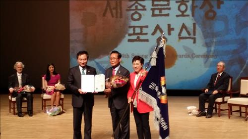 (서울=연합뉴스) 왕길환 기자 = 14일 오전 서울 서초동 국립국악원 우면당에서 제34회 세종문화상을 받은 사단법인 해외동포책보내기운동협의회(해동협·이사장 손석우)는 지난 2001년부터 14년 동안 재외동포들에게 무료로 책을 전달한 단체다.