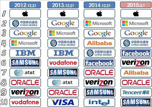 미국 기업과 삼성전자를 제외하고는 중국 최대 이동통신사인 차이나모바일이 4위, 전자상거래업체 알리바바가 7위, 게임업체 텐센트가 9위에 오르는 등 중국 기업이 톱 10의 나머지 자리를 차지했다.