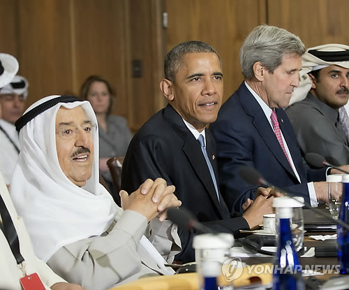| △ 오바마, 걸프 6개국 지도자에 '안보 강화' 약속 (워싱턴 AP=연합뉴스) 버락 오바마 미국 대통령(가운데)이 14일(현지시간) 메릴랜드주의 대통령 휴양지 캠프 데이비드에서 열린 걸프협력회의(GCC) 6개국 정상급과의 회담에 참석하고 있다. 왼쪽에 셰이크 사바 알아흐마드 알사바 쿠웨이트 국왕이, 오른쪽에 존 케리 미 국무장관이 자리하고 있다. 오바마는 이날 회담에서 이란 핵협상으로 야기된 이들 국가의 불안을 불식시키기 위해 안전보장 강화를 확약했다고 백악관 관계자는 밝혔다. |
