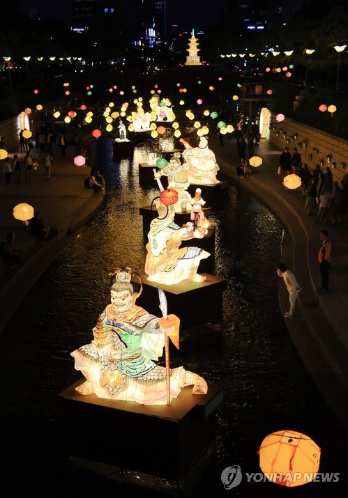 | △ 청계천을 수놓은 연등 (서울=연합뉴스) 이효석 기자 = 13일 오후 서울 종로구 청계천을 지나는 시민들이 석가탄신일을 앞두고 설치된 연등을 구경하고 있다. |