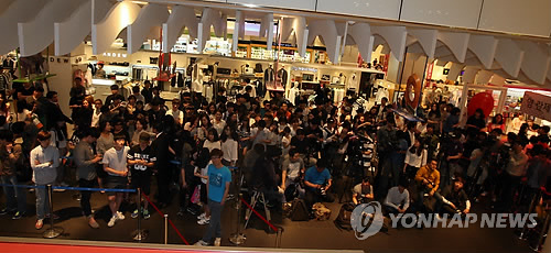 패션브랜드 사인회서 팬들과 악수…취재진·시민 붐벼