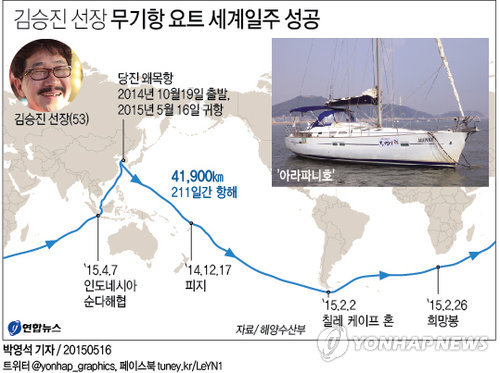 지난해 10월 19일 자신의 요트 '아라파니호'를 타고 왜목항을 출발한 김 선장은 바람의 힘으로 움직이는 세일링 요트를 타고 적도를 지나 피지, 칠레 케이프 혼, 남아프리카공화국 희망봉, 인도네시아 순다해협을 거쳐 다시 왜목항으로 돌아오는 4만1천900㎞의 바닷길을 홀로 항해했다.