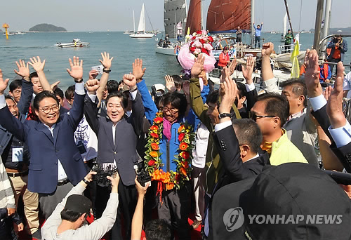 우리나라에서 처음으로 '무기항·무원조·무동력 요트' 세계일주에 성공한 김승진 선장이 16일 오후 3시께 충남 당진 왜목항에 도착했다. 지난해 10월 19일 이곳에서 출항한 지 일곱 달 만이다.