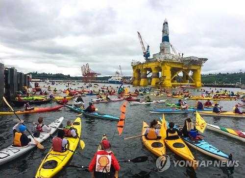 미국 환경보호단체 그린피스 회원 등 환경운동가 수백 명은 16일(현지시간) 미국 서부 워싱턴주 시애틀 앞바다인 엘리엇 만에서 셸의 북극해 시추 반대 시위를 벌였다.