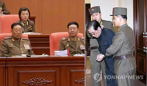 | △ 北 피의 숙청…현영철 장성택 둘다 불경죄 처형 (서울=연합뉴스) 김정은 북한 국방위원회 제1위원장이 지난달 30일 '불경죄'로 숙청한 현영철 전 인민무력부장(왼쪽)이 같은 달 24∼25일 김 제1위원장이 주재한 조선인민군 제5차 훈련일꾼대회에서 조는 듯한 모습이 포착돼 눈길을 끈다. 2013년 12월 12일에도 설렁설렁 박수쳤다는 이유로 김 제1위원장의 고모부이자 그의 '후견인'으로 알려진 장성택을 처형했었다. 오른쪽 사진은 북한이 공개한 포승줄에 묶인 처형직전의 장성택. << 노동신문 >> 2015.5.13 photo@yna.co.kr |