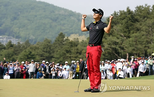 | △ 문경준 우승 세리모니 (서울=연합뉴스) 17일 경기도 성남 남서울cc 에서 열린 제34회 GS칼텍스 매경오픈에서 우승을 차지한 문경준이 세리모니를 하고 있다. 2015.5.17 << KPGA 제공 >> photo@yna.co.kr |