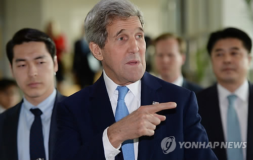| △ 한·미외교장관 회담 앞둔 존 케리 (서울=연합뉴스) 전수영 기자 = 존 케리 미국 국무장관이 18일 오전 서울 도렴동 외교부청사에서 윤병세 외교부 장관과 회담을 하기 위해 회담장으로 이동하고 있다. swimer@yna.co.kr |