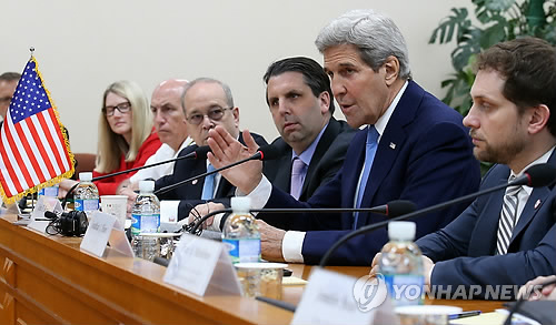 | △ 케리 美 국무부 장관 모두발언 (서울=연합뉴스) 전수영 기자 = 존 케리 미국 국무부 장관이 18일 오전 서울 외교부 청사에서 열린 윤병세 외교부 장관과의 한·미 외교장관 회담에서 모두발언을 하고 있다. |