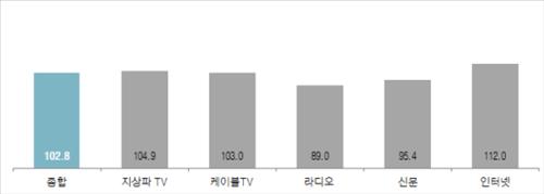 6월 매체별 KAI는 지상파TV 104.9, 케이블TV 103.0, 라디오 89.0, 신문 95.4, 인터넷 112.0으로, 대체로 보합세 또는 일부 하락세를 보일 것으로 예상됐다.