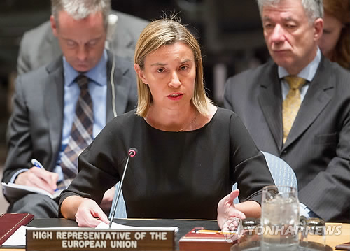 | △ (뉴욕 AP=연합뉴스) 페데리카 모게니리 유럽연합(EU) 외교안보 고위대표가 11일(현지시간) 미국 뉴욕 유엔 안전보장이사회(안보리)에서 EU의 군사작전에 대한 지지를 요청했다. |