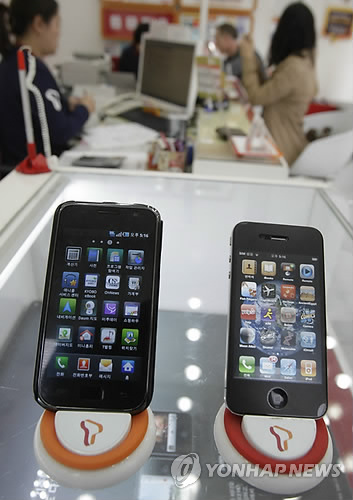 | △ (AP=연합뉴스/자료사진) 삼성전자의 '갤럭시 S' 스마트폰과 애플의 '아이폰 4' 기종이 2011년 4월 한국의 한 판매장에 나란히 전시된 모습. |