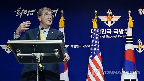 | △ 사드 답변하는 카터 미 국방장관 애쉬턴 카터 미 국방장관이 지난달 10일 오후 서울 용산구 국방부에서 한미 국방장관 회담 후 가진 기자회견에서 미국의 고고도미사일방어체계 '사드(THAAD)'와 관련해 취재진의 질문에 답하고 있다.(연합뉴스 자료사진) |
