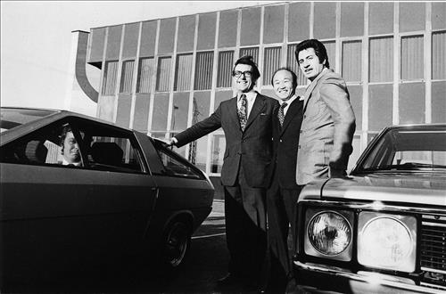 | △ 1974년 토리노 모터쇼에 참석한 정세영 명예회장이 조지턴불 부사장(좌측), 조르제토 주지아아로(우측)와 함게 포즈를 취하고 있다. 사진 현대산업개발 제공. |