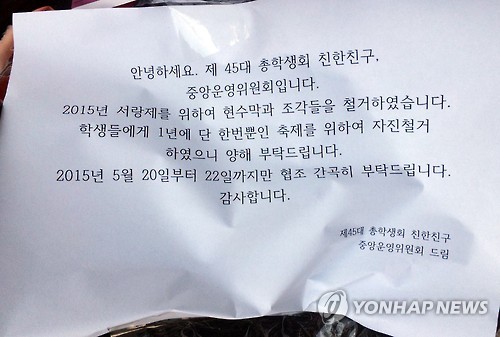 정지우 총학생회장은 "축제 주제를 '전통'으로 잡아서 청사초롱을 달았는데 현수막이 있으니 을씨년스럽고 보기 안 좋다는 의견이 있었다"며 "일 년에 한 번뿐인 축제라서 예쁘게 진행하고 싶었다"고 말했다.