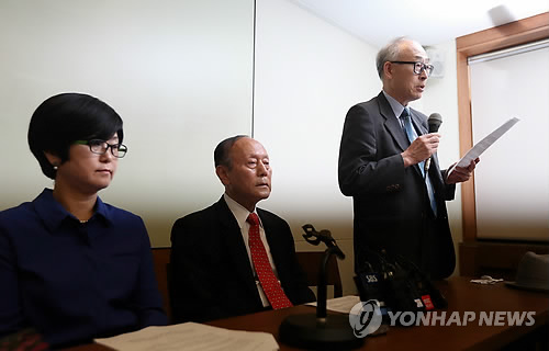 | △ '광복 70년, 615 15년' 남북회의 결과 발표 (서울=연합뉴스) 신준희 기자 = 지난 8일 오후 서울 중구 프란치스코 교육회관에서 열린 '광복70돌, 615공동선언 발표 15돌 민족공동행사 준비위원회' 기자회견에서 상임대표인 이윤배 흥사단 이사장이 남북 합의 결과를 발표하는 모습. 왼쪽부터 김금옥 한국여성단체연합 상임대표과 이창복 615남측위 상임대표. 2015.5.8 hama@yna.co.kr |