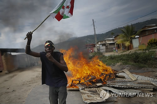 | △ 부룬디 '3선'출마 반대 시위 (부줌부라<부룬디> EPA=연합뉴스) 19일(현지시간) 중부 아프리카 부룬디의 수도 부줌부라 시내에서 피에르 은쿠룬지자 대통령의 3선 출마에 반대해 약 한 달째 반정부 시위가 계속되고 있는 가운데 불타는 노점 앞에서 한 시위자가 국기를 흔들고 있다. 2010596@yna.co.kr |