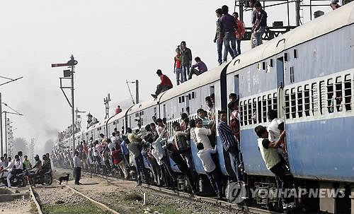 | △ 올해 2월26일(현지시간) 인도 우타르프라데시주 로니타운에서 승객들이 열차에 매달린 채 열차가 출발하고 있다.(EPA=연합뉴스 자료사진) |