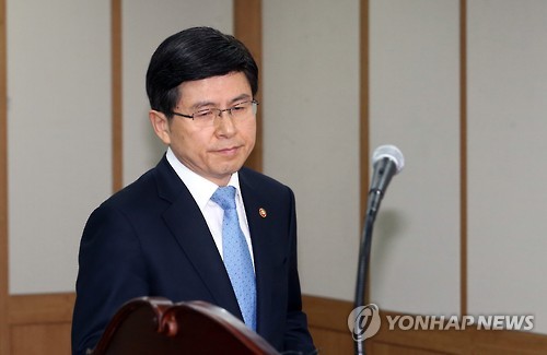 | △ 회견장 들어서는 황교안 신임 국무총리 후보자 (과천=연합뉴스) 최재구 기자 = 신임 국무총리에 내정된 황교안 법무부 장관이 21일 정부 과천청사에서 총리 후보 지명과 관련한 입장발표를 위해 회견장으로 들어서고 있다. |