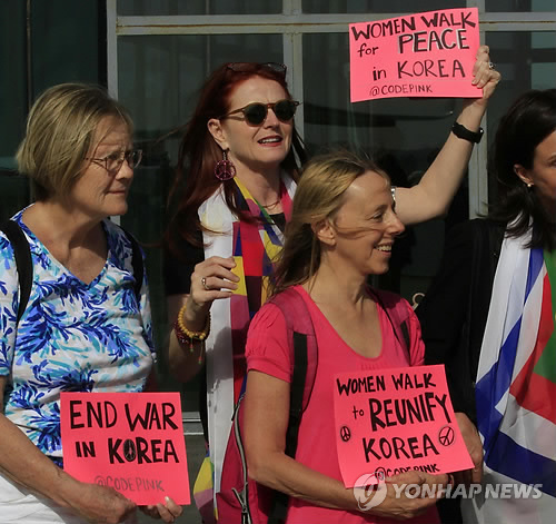 | △ '위민크로스DMZ' (평양 AP=연합뉴스) 판문점을 통해 남북 비무장지대(DMZ)를 통과하기를 희망하고 있는 세계 여성평화운동단체 '위민크로스디엠지'(WCD) 회원들이 평양 국제공항에 도착했다. |