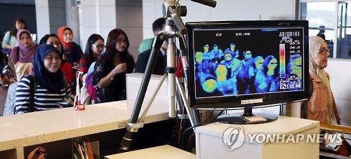 | △ 중동호흡기증후군 환자 확인....공항 검역 강화 (영종도=연합뉴스) 김주성 기자 = 신종 바이러스인 중동호흡기증후군(메르스)에 감염된 한국인 환자가 처음으로 확인됨에 따라 공항과 항만에서 중동지역 입국자에 대한 검역이 강화됐다. 21일 오전 인천공항에 도착한 입국객들이 발열 감시 적외선 카메라가 설치된 검역대를 통과하고 있다. utzza@yna.co.kr |