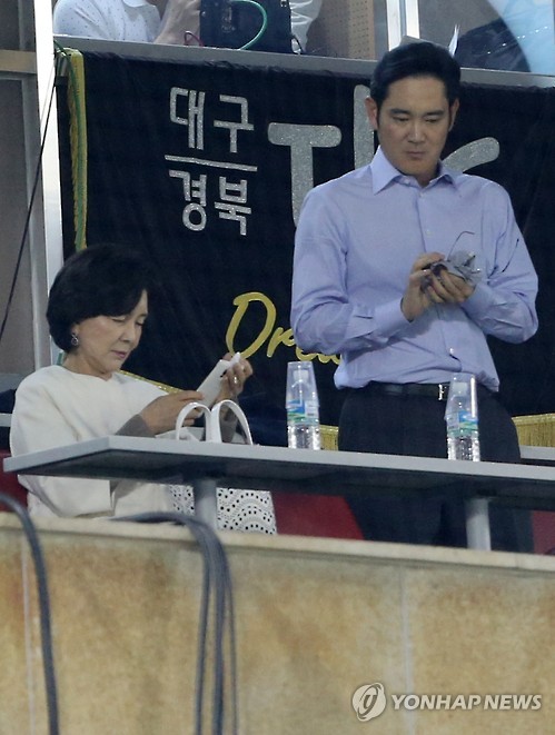 (서울=연합뉴스) 옥철 김지헌 기자 = 이재용 삼성전자[005930] 부회장과 이 부회장의 어머니인 홍라희 삼성미술관 리움 관장이 야구장을 찾았다.