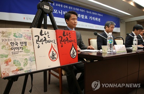 | △ 전국 도서관 어린이·청소년 근현대사 추천도서 모니터링 결과발표 (서울=연합뉴스) 전수영 기자 = 청년지식인포럼 Story K 주최 정부 및 교육청 산하 전국 도서관 어린이·청소년 근현대사 추천도서 모니터링 결과발표가 19일 오전 서울 프레스센터에서 열렸다. 류현수(왼쪽) Story K 연구위원이 모니터링 결과를 발표하고 있다. 2015.5.19 swimer@yna.co.kr |