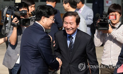 | △ '입경 미소' (파주=연합뉴스) 임병식 기자 = 정기섭 개성공단기업협회장이 22일 오후 경기도 파주시 경의선 남북출입사무소에서 입경해 활짝 웃으며 통일부 관계자와 악수하고 있다. |