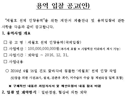 사업기간은 2016년 12월31일로 명시했으나 최대한 조기에 인양을 유도한다는 방침이다. 입찰참가 등록은 6월22일 오후 6시까지, 제안서는 다음날 오후 2시까지 받는다.