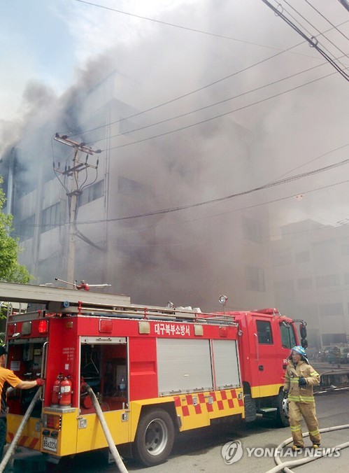 | △ 대구 3공단 불 (대구=연합뉴스) 김선형 기자 = 23일 대구시 북구 3공단 내 의류공장 화재 현장에서 소방관들이 진화를 하고 있다. 2015.5.23 sunhyung@yna.co.kr |