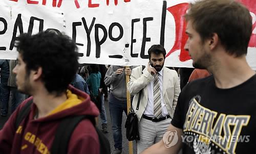 | △ 그리스 아테네에서 국제 채무 탕감을 요구하는 시위에서 한 참가자가 '유로화와 유럽연합(EU) 탈퇴'라고 쓰인 긴 팻말을 들고 있는 모습. |
