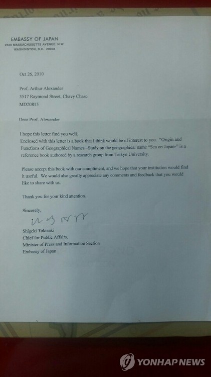 | △ 주미일본대사관 배포 추정 '일본해 합리화' 편지 발견 (서울=연합뉴스) 고은지 기자 = 주미일본대사관이 동해의 일본해 표기를 합리화하고자 미국 대학이나 기관을 상대로 '학술 외교'를 벌인 것으로 추정되는 편지. 2010년 10월 26일 보낸 편지에서 주미일본대사관은 조지타운대 아서 알렉산더 일본경제연구소장에게 동해의 일본해 표기를 합리화하기 위한 연구가 담긴 서적을 함께 보내며 연구에 써달라고 요청했다.(김태진 대표 제공) |