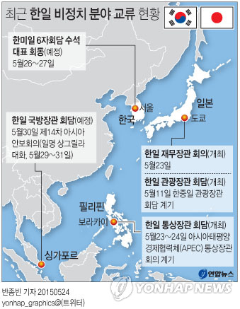 (서울=연합뉴스) 이귀원 기자 = 한일간 과거사 문제를 둘러싼 갈등이 계속되고 있는 가운데 최근 안보, 경제, 관광 등 이른바 비정치 분야에서의 교류 협력이 가속화되고 있다.