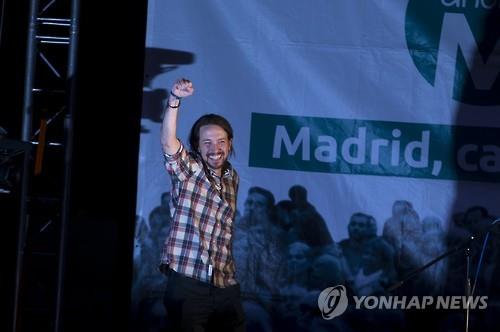 | △ 스페인 지방선거에서 약진한 좌파연합 아오라 마드리드에 참여하고 있는 좌파정당 포데모스의 파블로 이글레시아스가 환호하는 군중에 답하고 있다(AP=연합뉴스) |