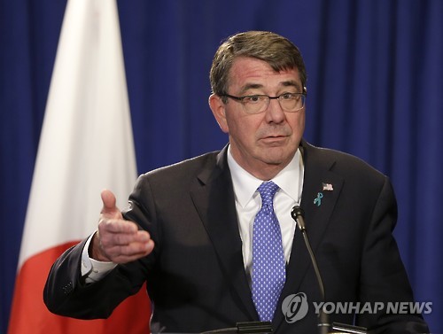 | △ 지난 4월27일(현지시간) 미국 뉴욕에서 열린 미-일 외교.국방장관 연석회의 참석 직후 기자회견을 하고 있는 애슈터 카터 미 국방장관의 모습. (AP Photo/Seth Wenig) |
